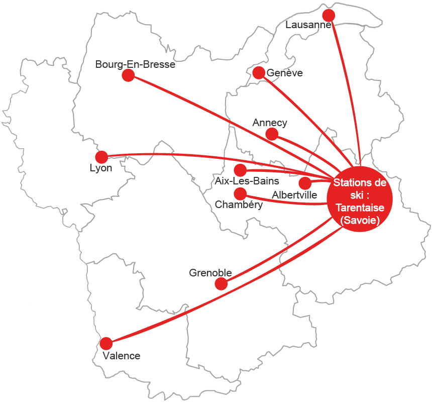 От большинства станций, аэропорты, гостиницы регион Рона-Альпы и Швейцарии , мы служим горнолыжные курорты Тарантез в самом сердце Савойи , как :